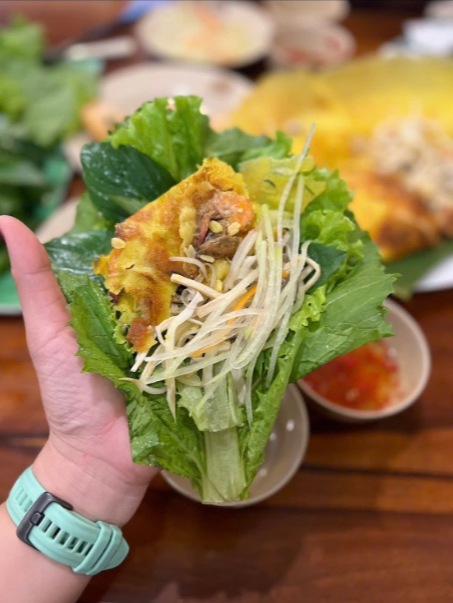 Thưởng thức khi còn nóng để cảm nhận được trọn vẹn độ giòn, độ béo và vị thanh mát của rau sống.